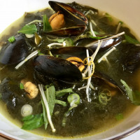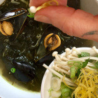 In a large pot, bring 12 cups of water to a boil. Add in braised miyeok, soup soy sauce, salt & pepper and return to a boil. Then, lower to medium heat and cook for 20 minutes. Stir in uncooked mussels and continue to cook on medium heat for 5 mins. Add in half of the scallions, enoki & lemon zest, stir well, cook for another 5 mins.